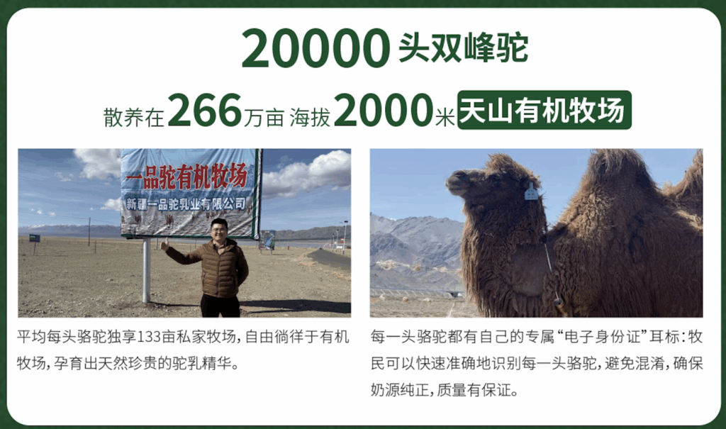一品驼遵循自然理念,延续传统的牧养形式,将200000头双峰驼散养在266万亩、海拔2000米的天山有机牧场,每头骆驼独享133亩私家牧场。